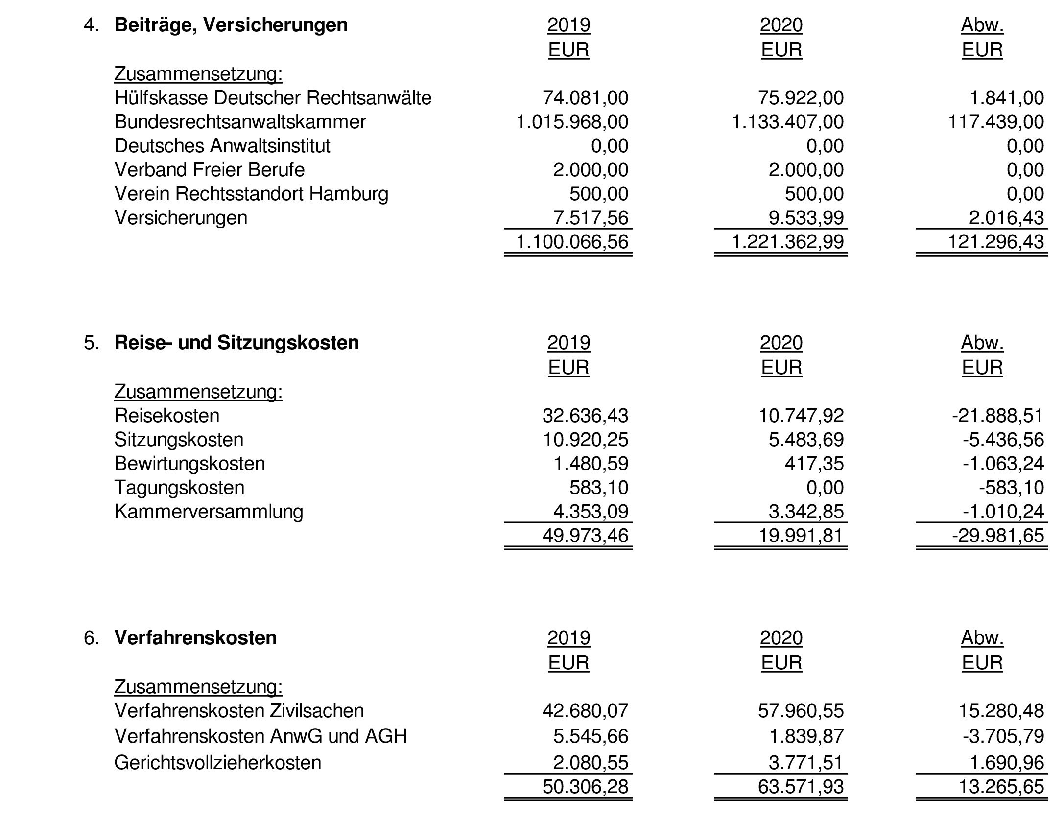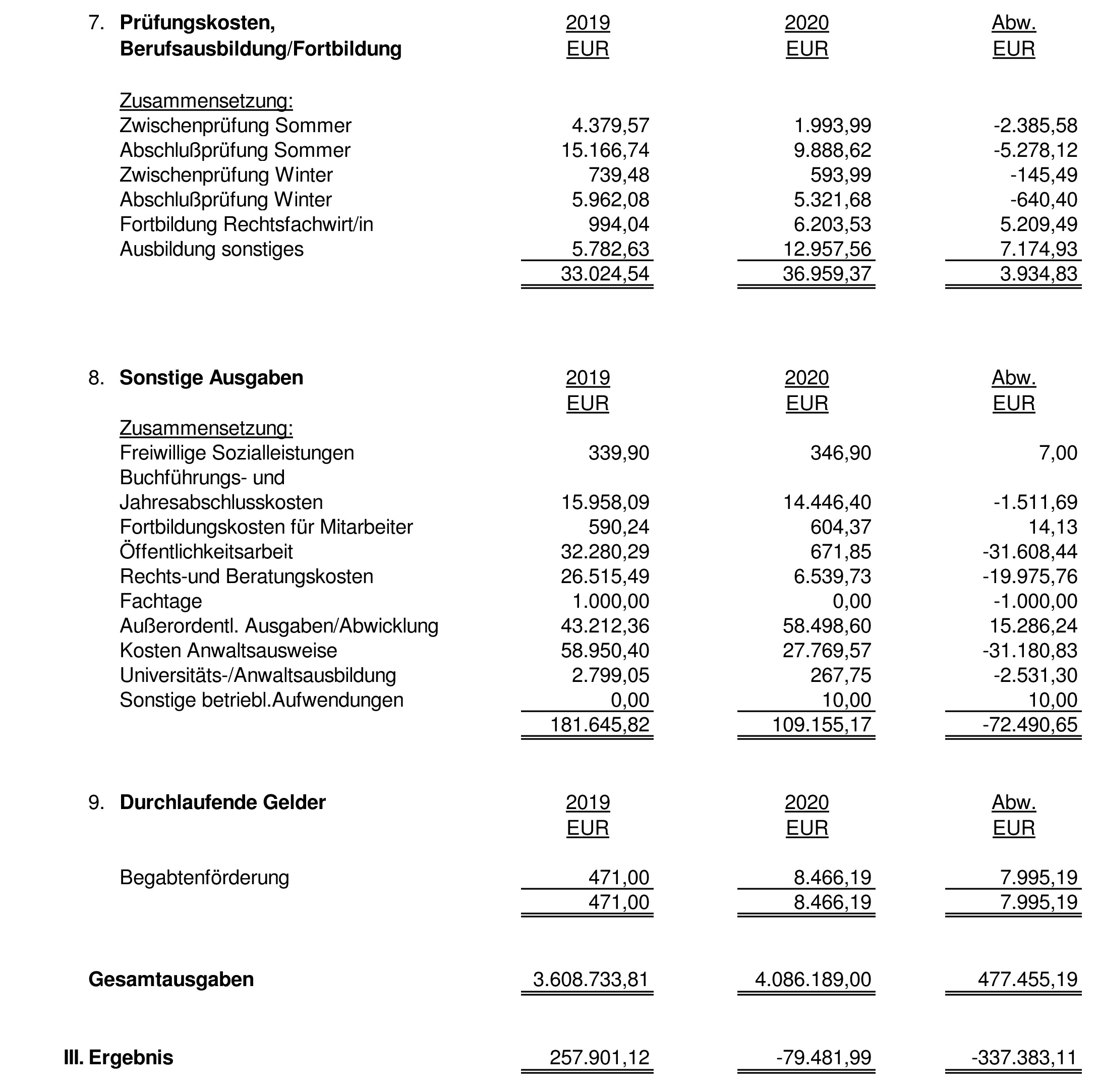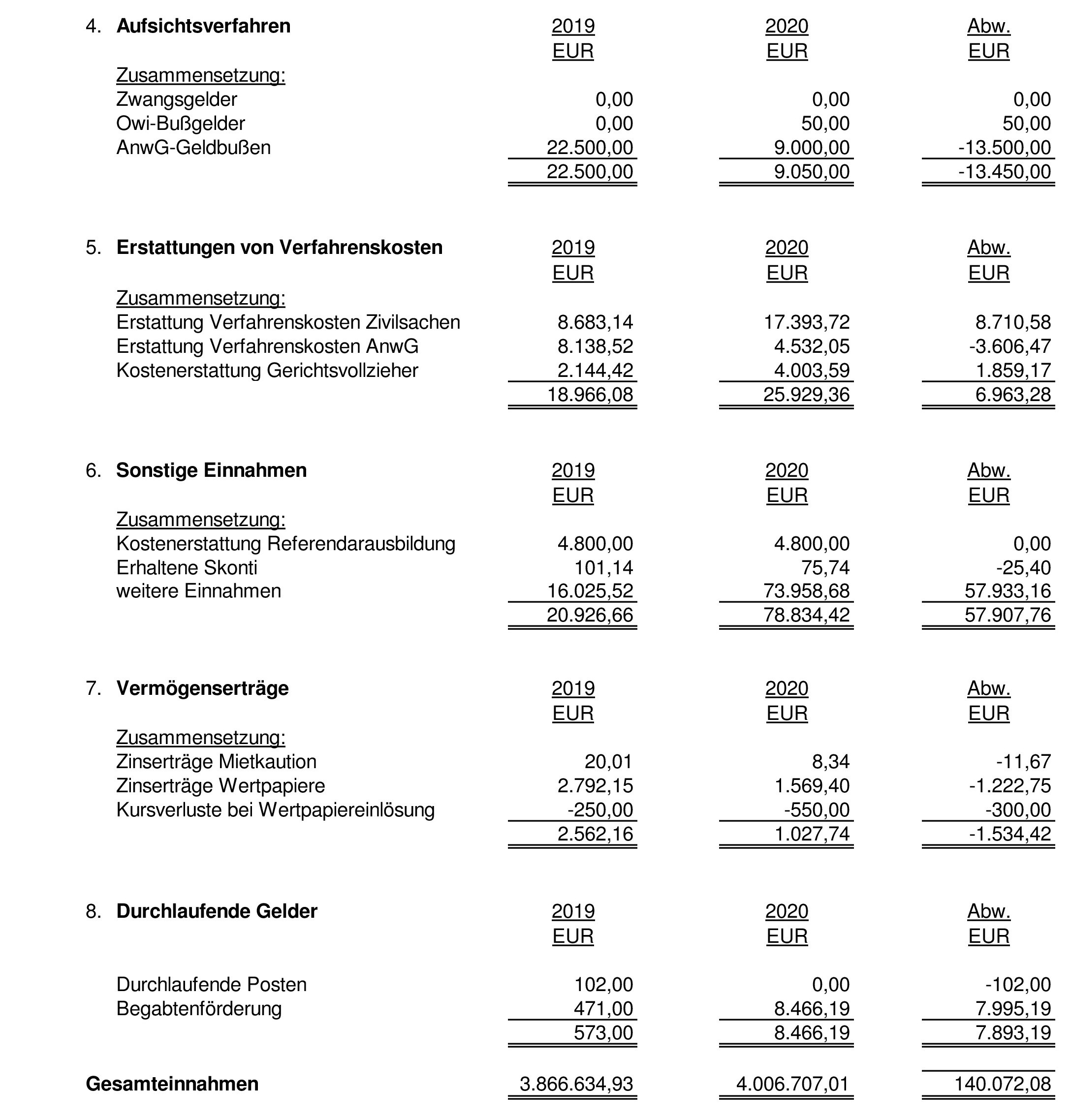 Anlage 2: Einzel- und Abweichungsdarstellung der Einnahmen- und Ausgabenrechnung für das Geschäftsjahr 2020