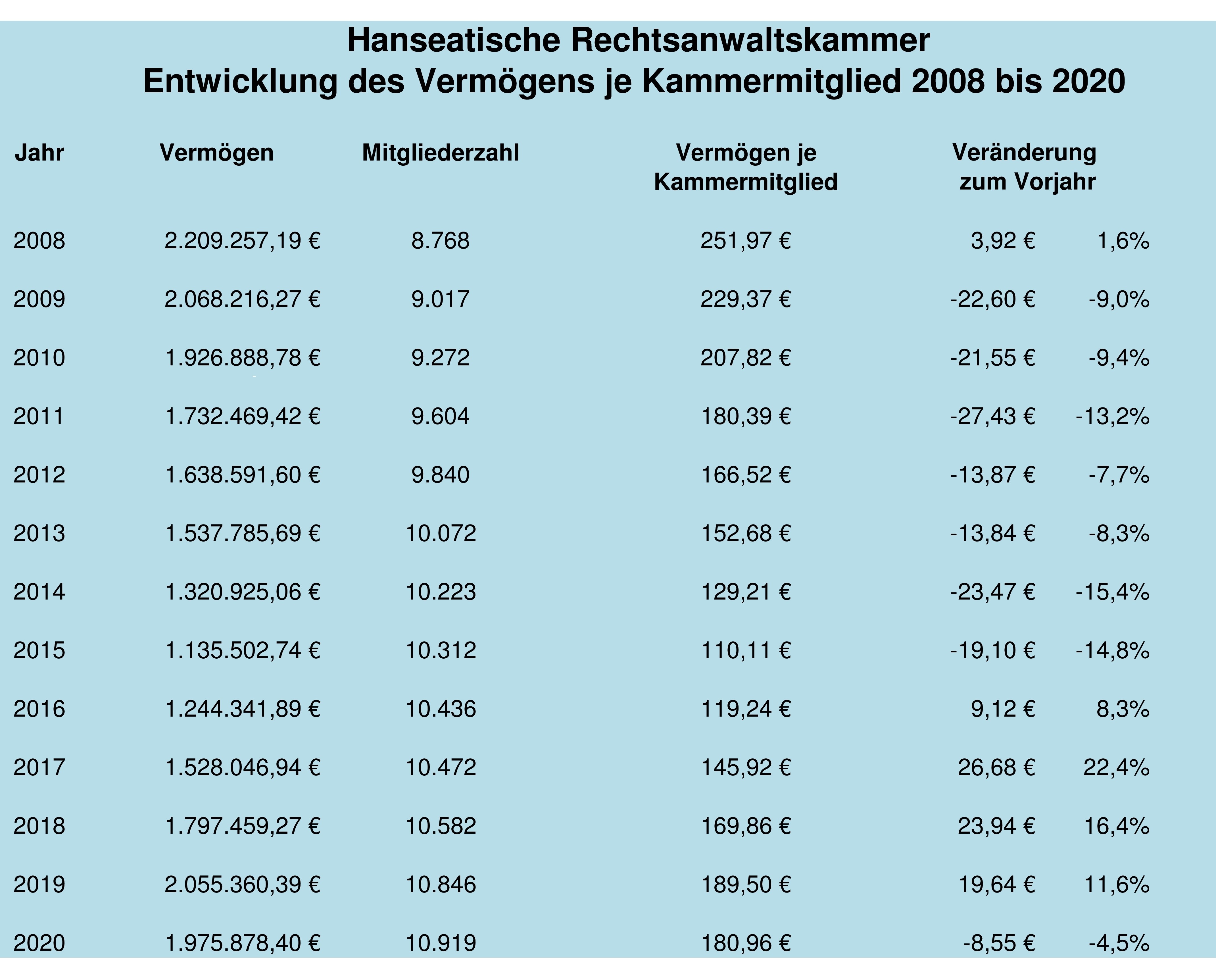 Sie finden als Anlagen 5 bis 8 die Abrechnung über die im Jahre 2004 erstmalig für die anwaltsbezogene Referendarausbildung erhobene Ausbildungsumlage. Sie wurde in 2020 in Höhe von Euro 6,00 (Vorjahr: Euro 6,00), als Teilbetrag der von der Kammerversammlung im Jahre 2003 beschlossenen Euro 25,00, pro Mitglied erhoben.