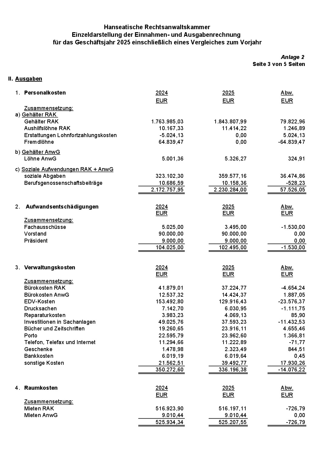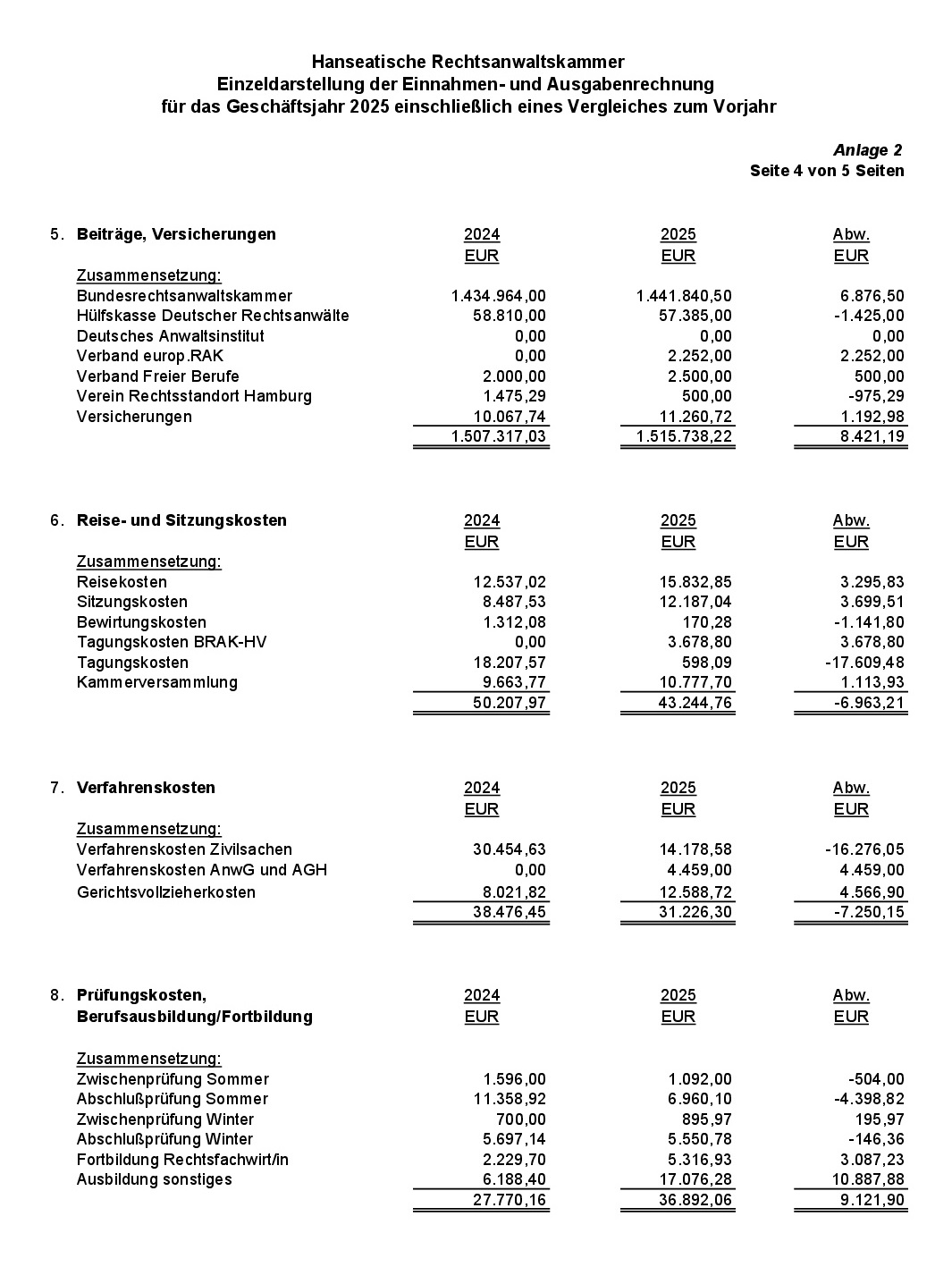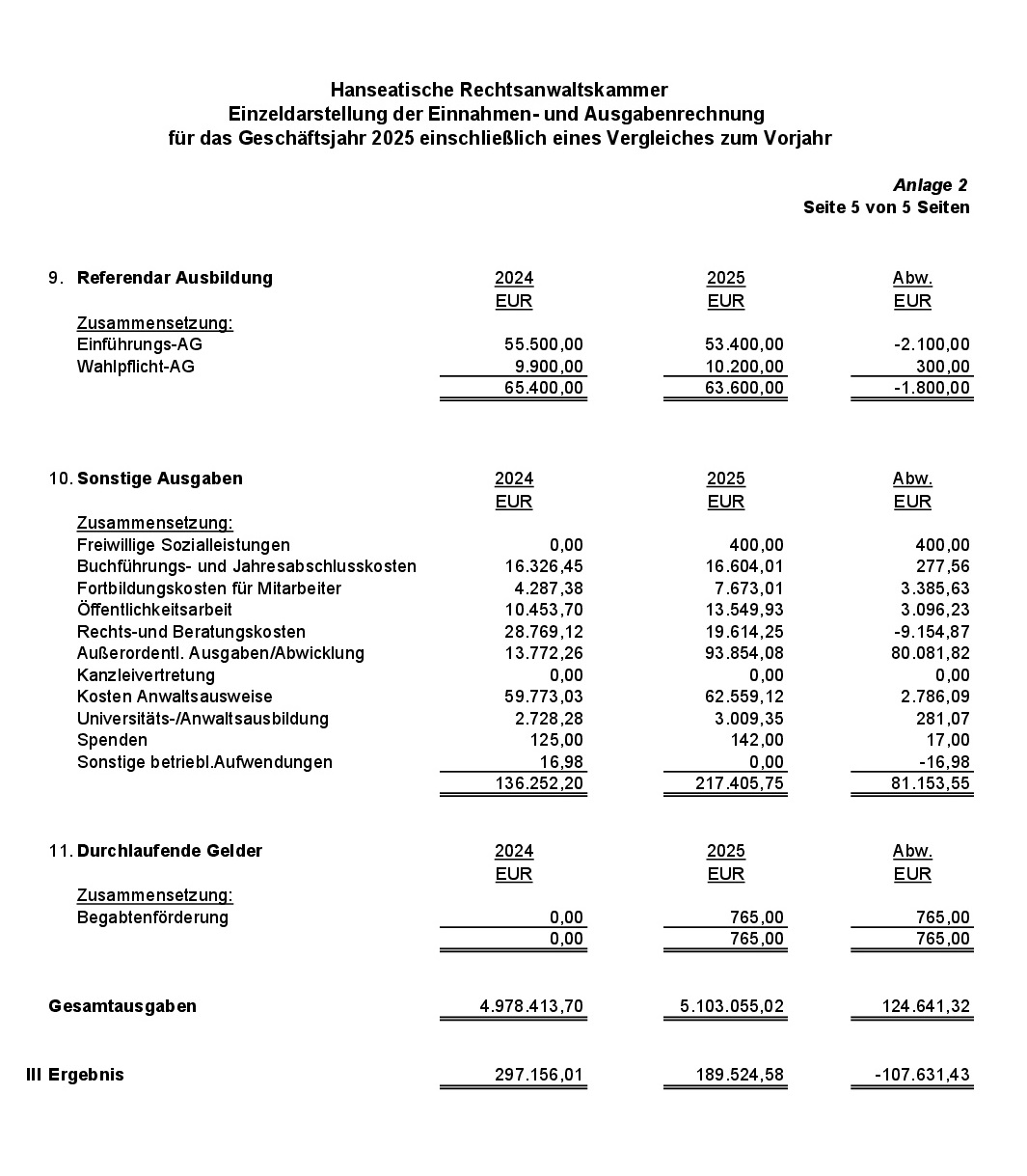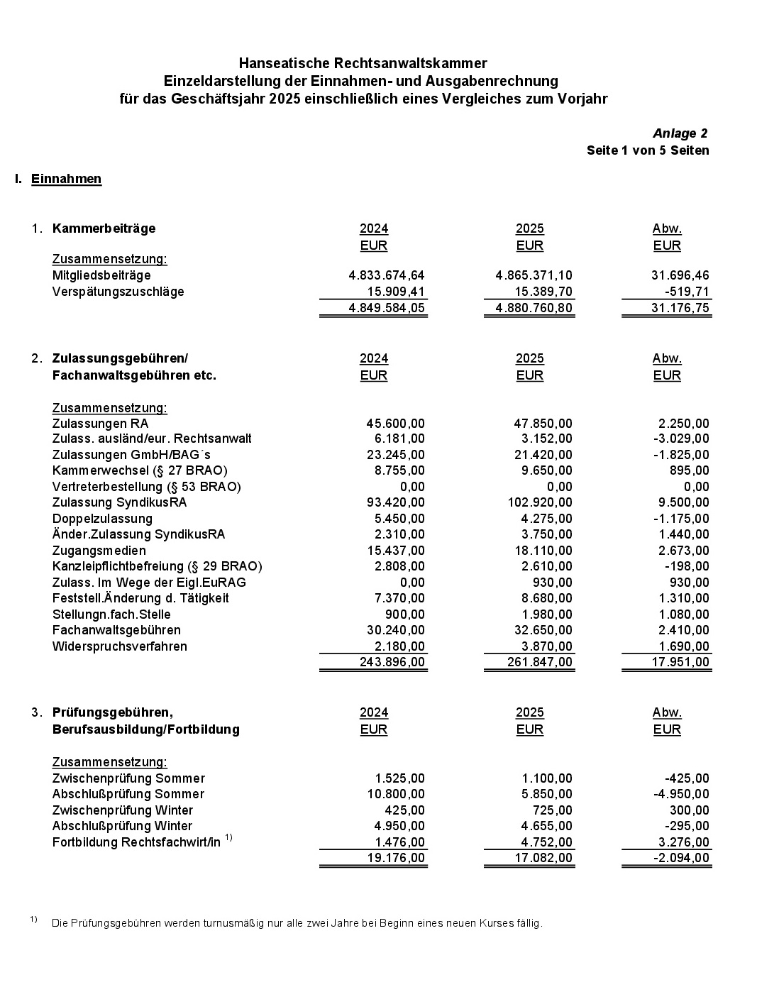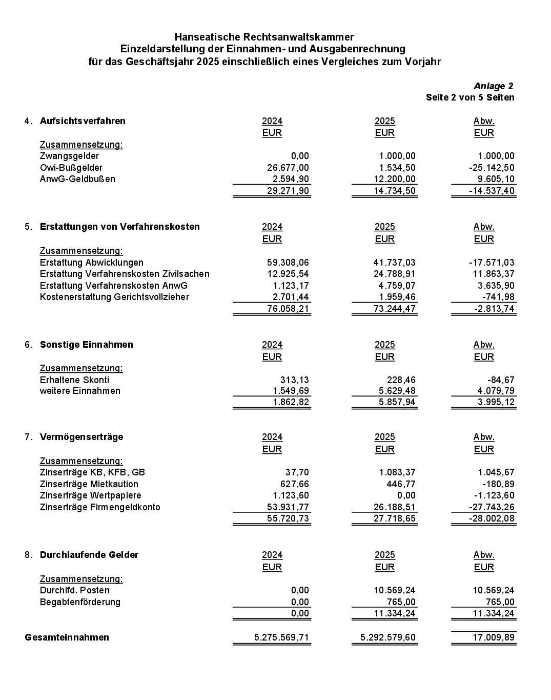 Anlage 2: Einzeldarstellung der Einnahmen- und Ausgabenrechnung für das Geschäftsjahr 2025
